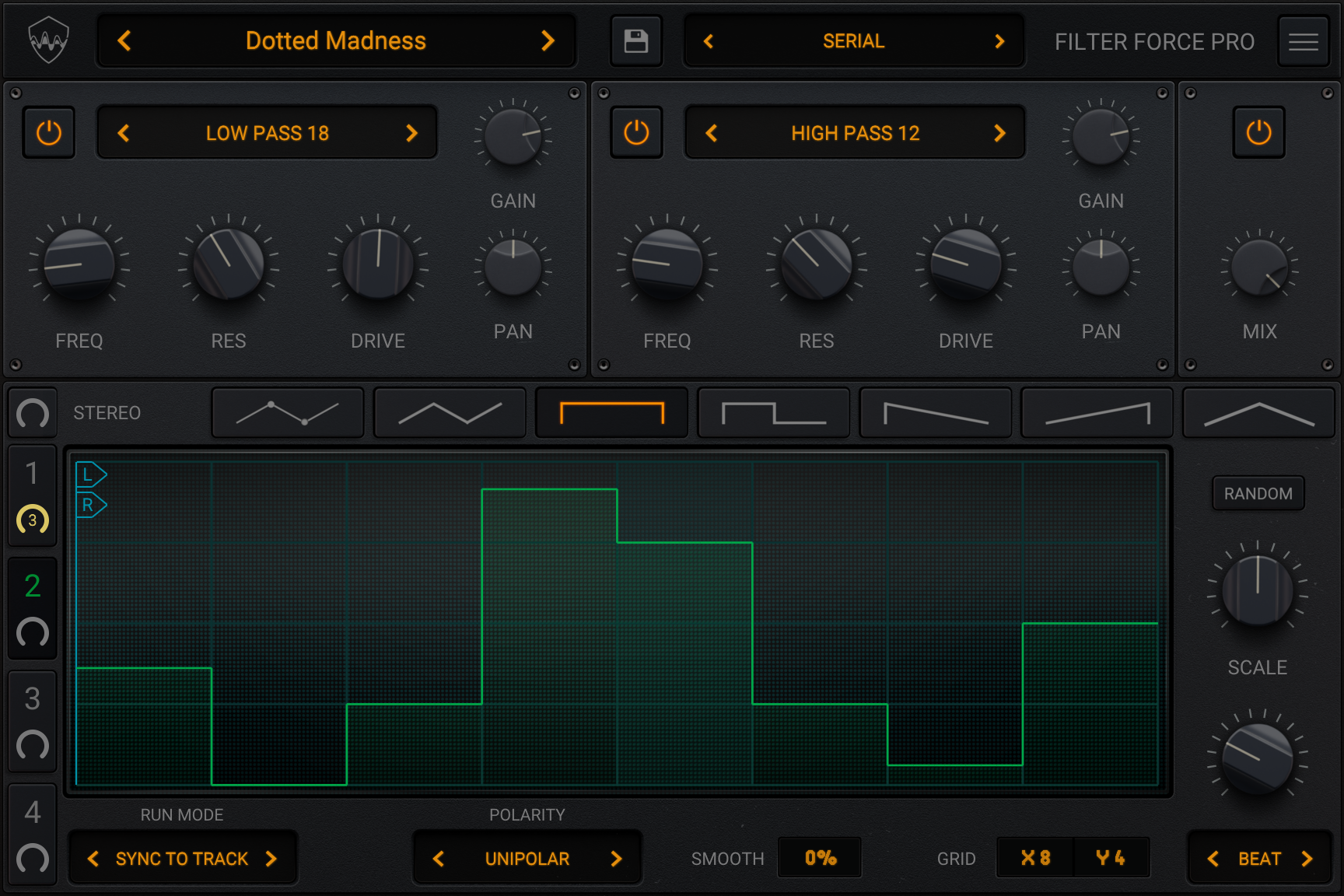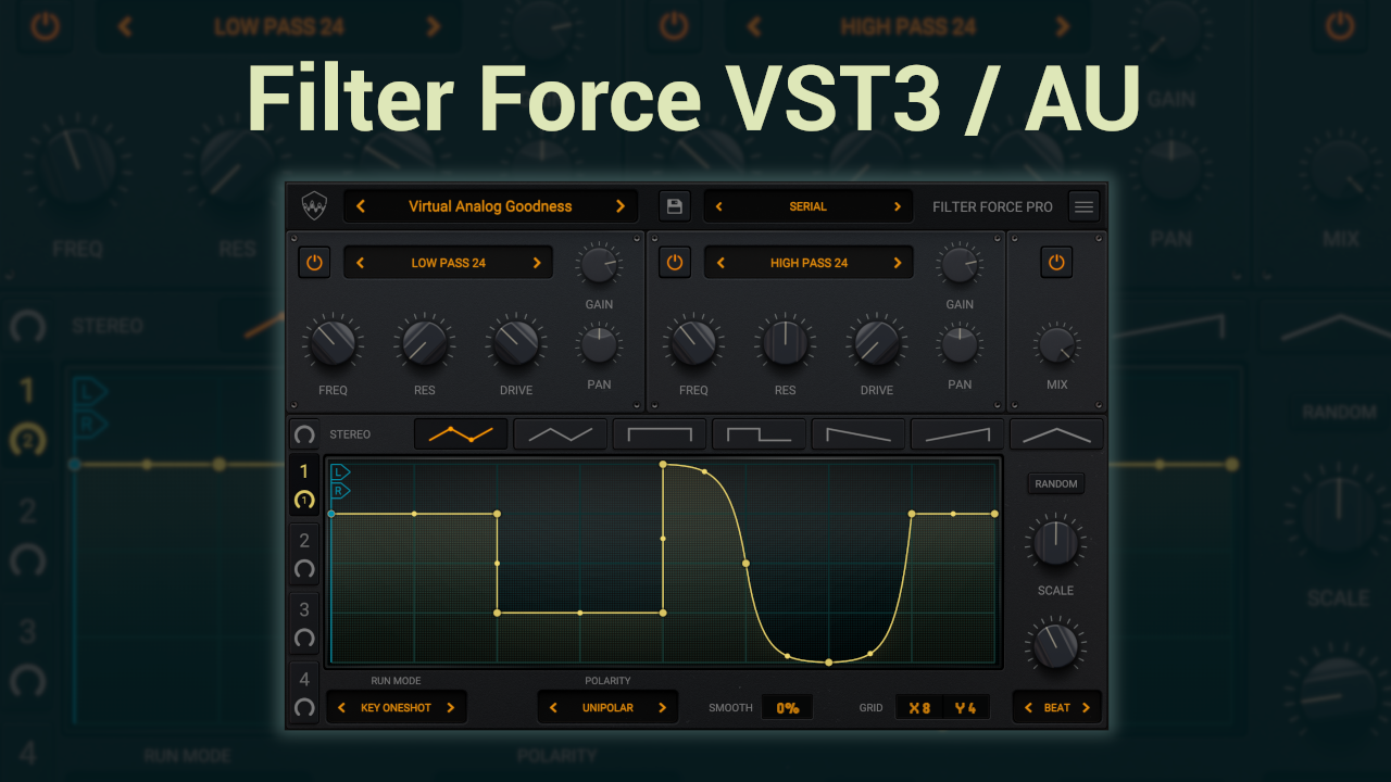 Filter Force is a dual creative filter bank with a focus on easy and intuitive modulation. Quickly shape up any sound or instrument with high-quality modulated filters.